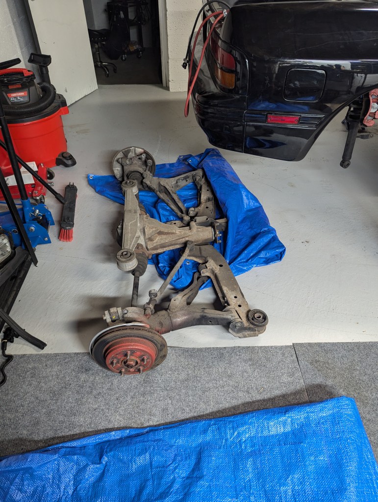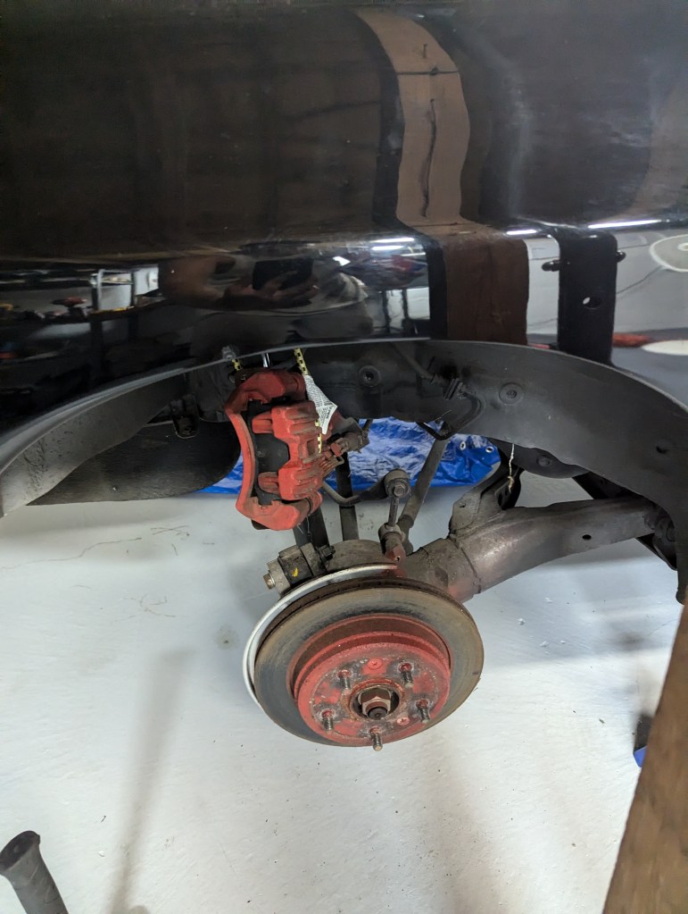 The car was already on jack stands the first thing I did was support the differential using my handy Harbor Freight transmission jack. Next, simply take off the brake calipers and support them on the springs with bungee cord or anything really.