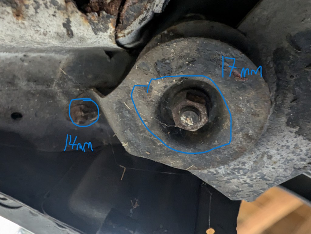 Now time to get under the car. There are two front mounts for the rear subframe. Use a 17mm and 14mm socket to get them off. Make sure to wear a mask and eye pro, because there is a ton of nastiness that got in there over the years.