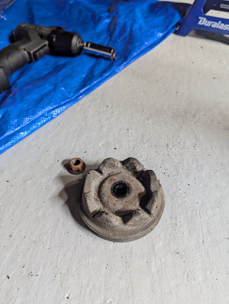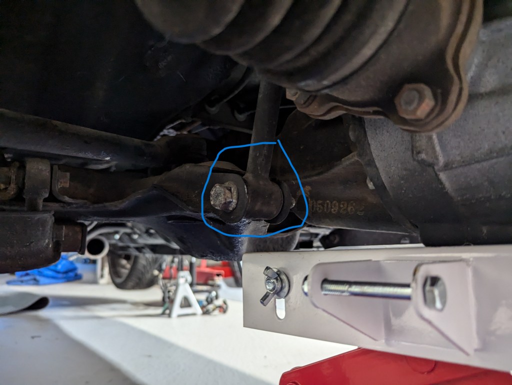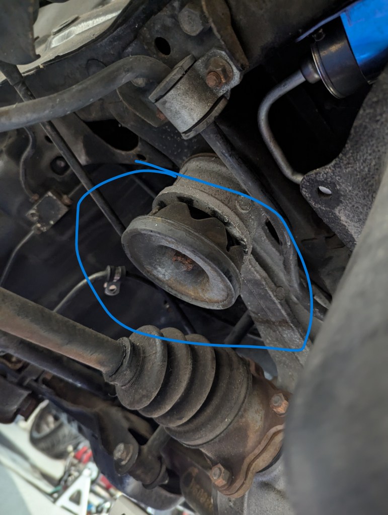 Lastly, there is a vertical link support on the driver side of the diff. This one was a bit tough for me to get out. It’s a 17mm bolt and nut, but the bolt just did not want to come out! I used an oversized socket with a vice to press the bolt out. I feel like putting this back in will be no fun..thats a future Andrew problem.
