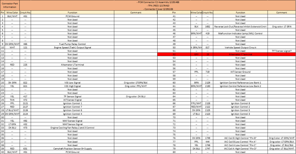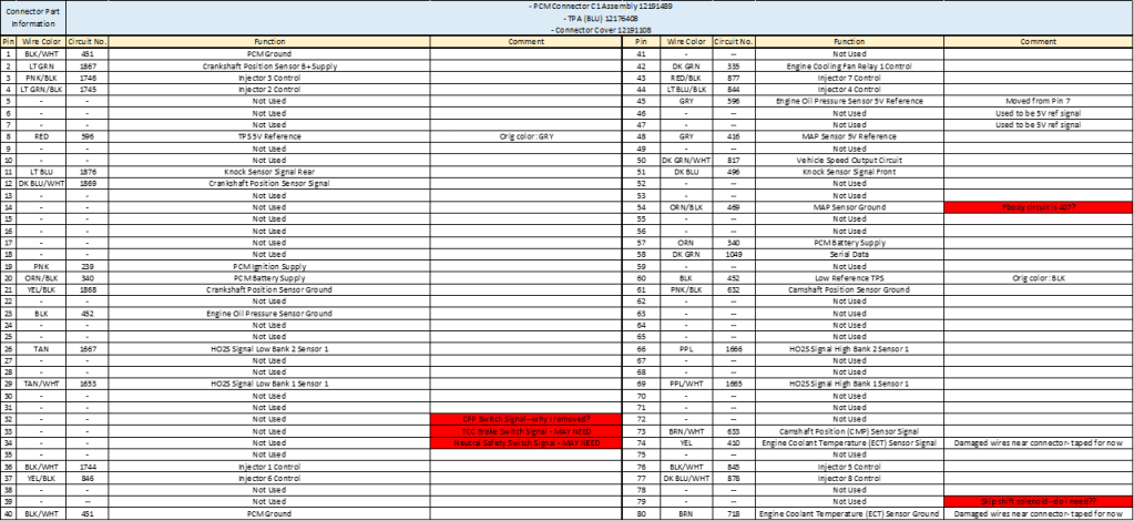 The table down here is the final pinout for the PCM. It’s basically the same as a 2000 F-body with a few extra stuffs taking advantage of the extra 5V and low reference signals coming from the computer. Gotta use what you got ya know??