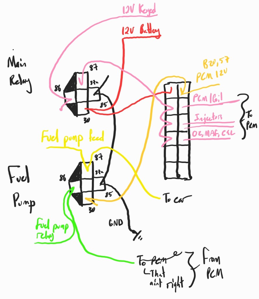 These two sheets were a godsend when trying to figure out how to power the PCM and engine components. The main relay is wired in a very basic fashion. If you don’t know what a relay is, its essentially a switch, like how you turn a light on and off. But instead of your hand doing the on/off state, a signal from the PCM controls that. Let’s start simple, Pin 85 on the relay is wired to ground and Pin 30 is receiving a constant 12V. These form the basic power supply for the relay’s switching action. The trigger or switch on the relay is Pin 86, and is wired to the keyed ignition 12V at the ignition switch. So when the key is turned to the “On” position, Pin 86 will receive voltage causing the relay switch to activate. This will swing a mechanical arm (youcan hear an audible click when this happens) to open the circuit between Pin 30 and Pin 87. Pin 87 will then power a bank of fuses, which then turn on the PCM and components. Similarly, the fuel pump relay still has the ground and 12V at Pins 85 and 30. Except now, once the PCM is turned on, the fuel pump signal wire is triggered to send the “on” signal to the fuel pump.